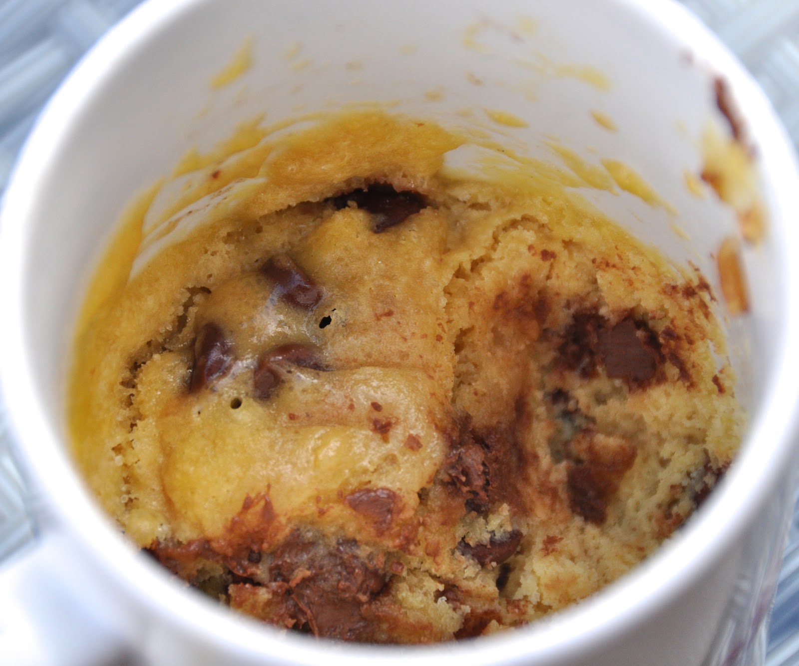 It’s midnight, and your stomach growls. It’s craving one of those warm, soft cookies scattered with bits of chocolate. What to do? What to do? You make this recipe. It literally takes less than a minute to put together (if you’re fast) and even less to cook and eat. My favorite part about this cookie is that it actually tastes incredibly good- like a choc chip cookie right out of the oven. There are a few requirements: You must own a microwave, NOT have high cholesterol, and NOT be on a diet. It’s loaded- but seriously… it’s midnight; who cares?
